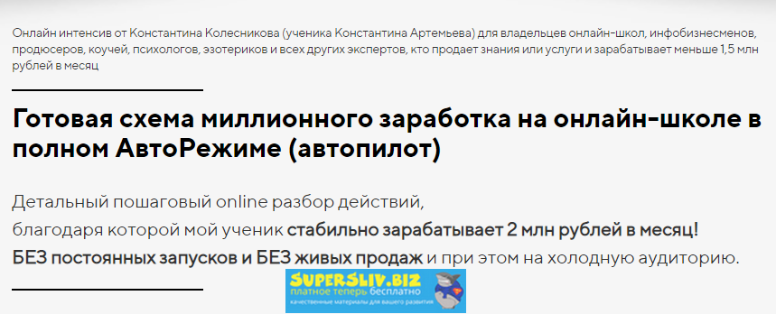 Онлайн интенсив от Константина Колесникова (ученика Константина Артемьева) для владельцев онлайн-школ, инфобизнесменов, продюсеров, коучей, психологов, эзотериков и всех других экспертов, кто продает знания или услуги и зарабатывает меньше 1,5 млн рублей в месяц