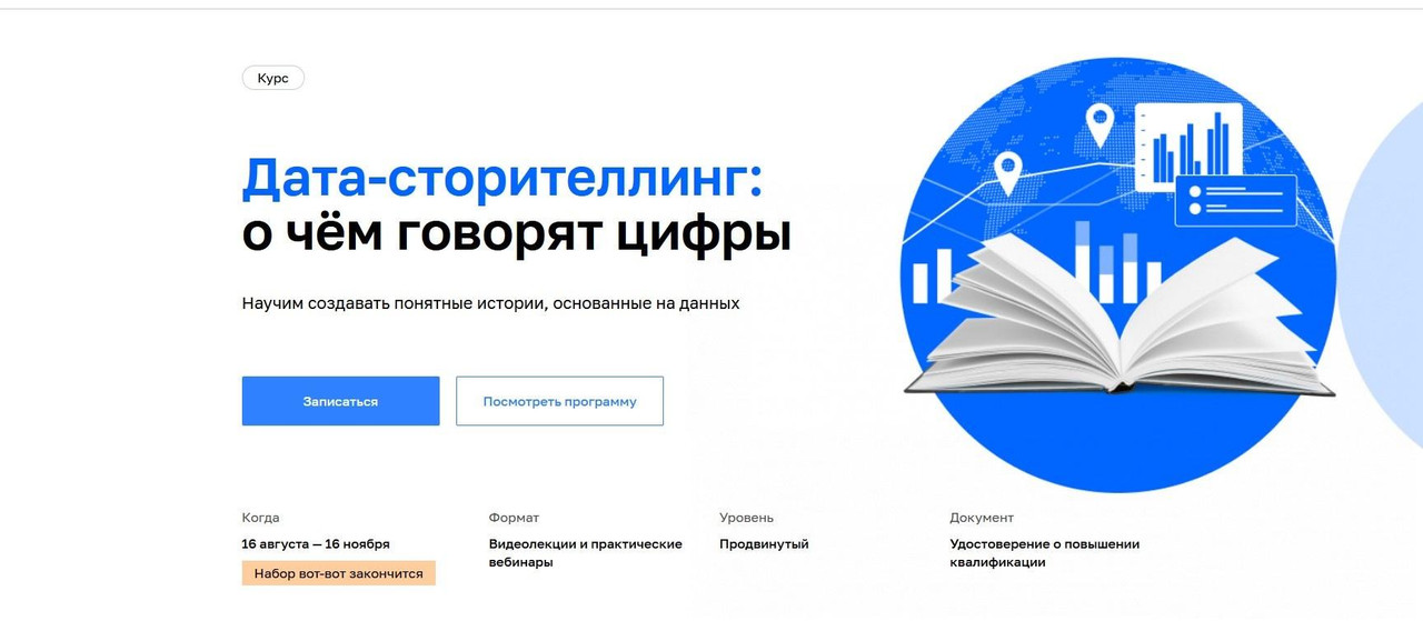 Этот насыщенный курс поможет детально погрузиться в тему дата-сторителлинга. Вы научитесь преобразовывать большие данные в историю и на практике узнаете, как создавать увлекательные журналистские исследования.